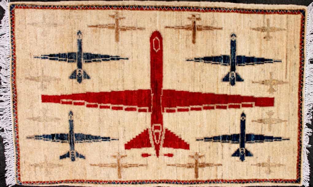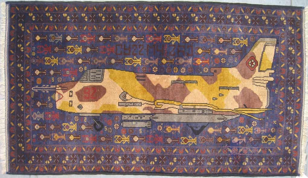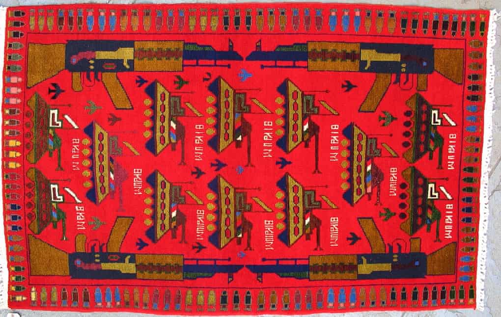 Poco después de la invasión soviética, las mujeres de la cultura baluchi empezaron a tejer en las alfombras la violencia que encontraban en su vida cotidiana. En estas resistentes alfombras de lana de pelo anudado que antes presentaban símbolos pacíficos y corrientes, tales como flores y pájaros ahora aparecían otros patrones. En las primeras alfombras de este tipo las imágenes agresivas estaban más bien ocultas. En aquellos primeros años, los intermediarios y comerciantes se negaban a comprar alfombras de guerra con diseños evidentes por miedo a que desanimaran a los compradores. Pero con el tiempo y con la creciente popularidad de las alfombras, las imágenes se hicieron tan prominentes que incluso se podían distinguir armas concretas, como los rifles AK-47, los Kalashnikov y las pistolas automáticas.
